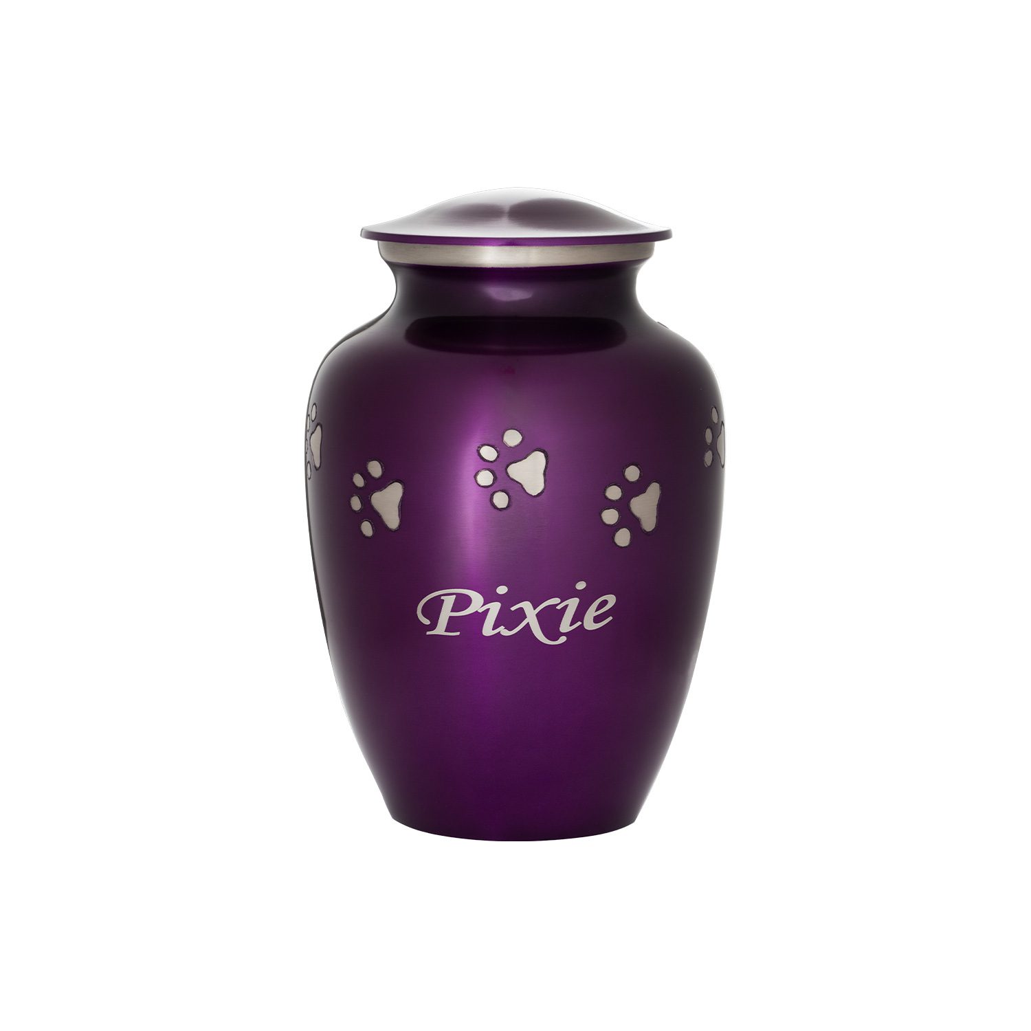 Made of solid brass this wonderfully designed pet urn is truly unique in style and color. You can add a customized engraving right on the urn itself and not only will it personalize your friend’s urn but it will enhance its beauty as the engraved letters shine through like silver. This urn is the 4th of twelve in the “Beloved Companion Series” designed and manufactured exclusively by Pet Passages. “The Amethyst” named for its beautiful violet color is decorated with paw prints and is true work-of-art. Amethyst is the February birthstone and it’s symbolic gift is Peace. Hand forged and carved by old-world artisans, each urn comes with a precisely threaded screw-on top to provide an easy way to secure your pet’s ashes.