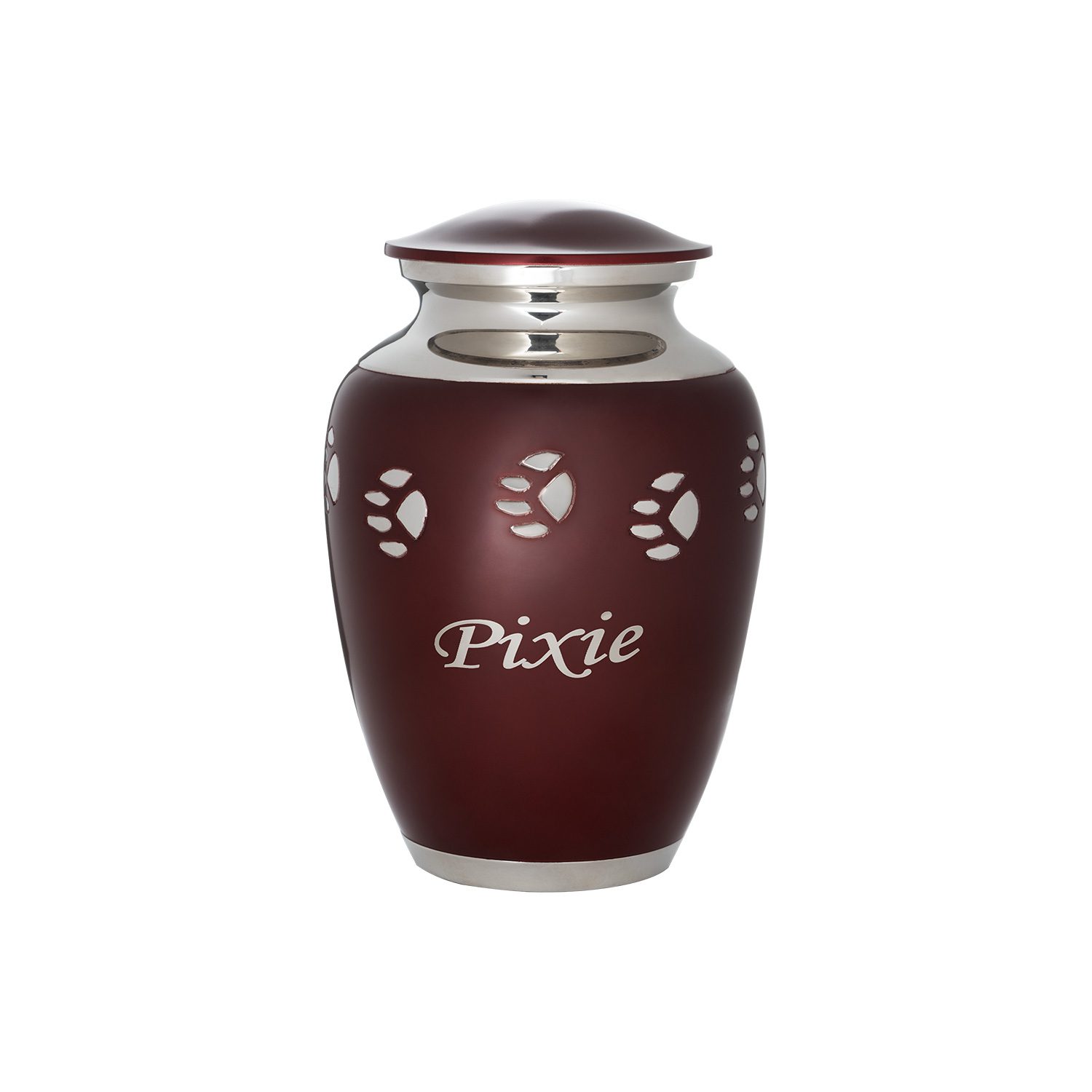 Made of solid brass this wonderfully designed pet urn is truly unique in style and color. You can add a customized engraving right on the urn itself and not only will it personalize your friend’s urn but it will enhance its beauty as the engraved letters shine through like silver. This urn is the 7th of twelve in the “Beloved Companion Series” designed and manufactured exclusively by Pet Passages. “The Garnet” named for its beautiful representation of a garnet and is accented with silver paw prints. A true work-of-art. Garnet is also the January birthstone and it’s symbolic gift is Safety. Hand forged and carved by old-world artisans, each urn comes with a precisely threaded screw-on top to provide an easy way to secure your pet’s ashes.