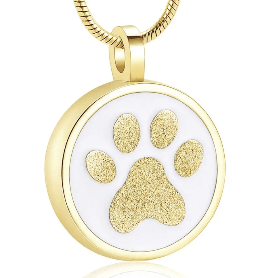 Keepsake pet jewelry is designed to keep the memory of your pet close to you by holding a small portion of your pet’s cremated remains. Our Classy Paw Pendant is made of stainless steel with a gold color finish, white enamel face with a gold paw. Unscrew the bail to reveal a secret space for holding your pet’s ashes close. Please Note: Chain not invluded. We recommend sealing the compartment closed after placing in the pet’s remains with clear super glue.