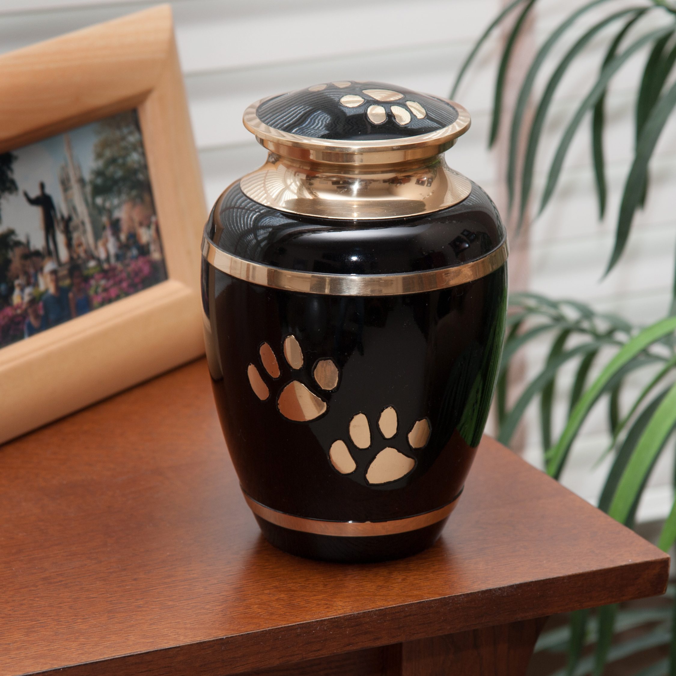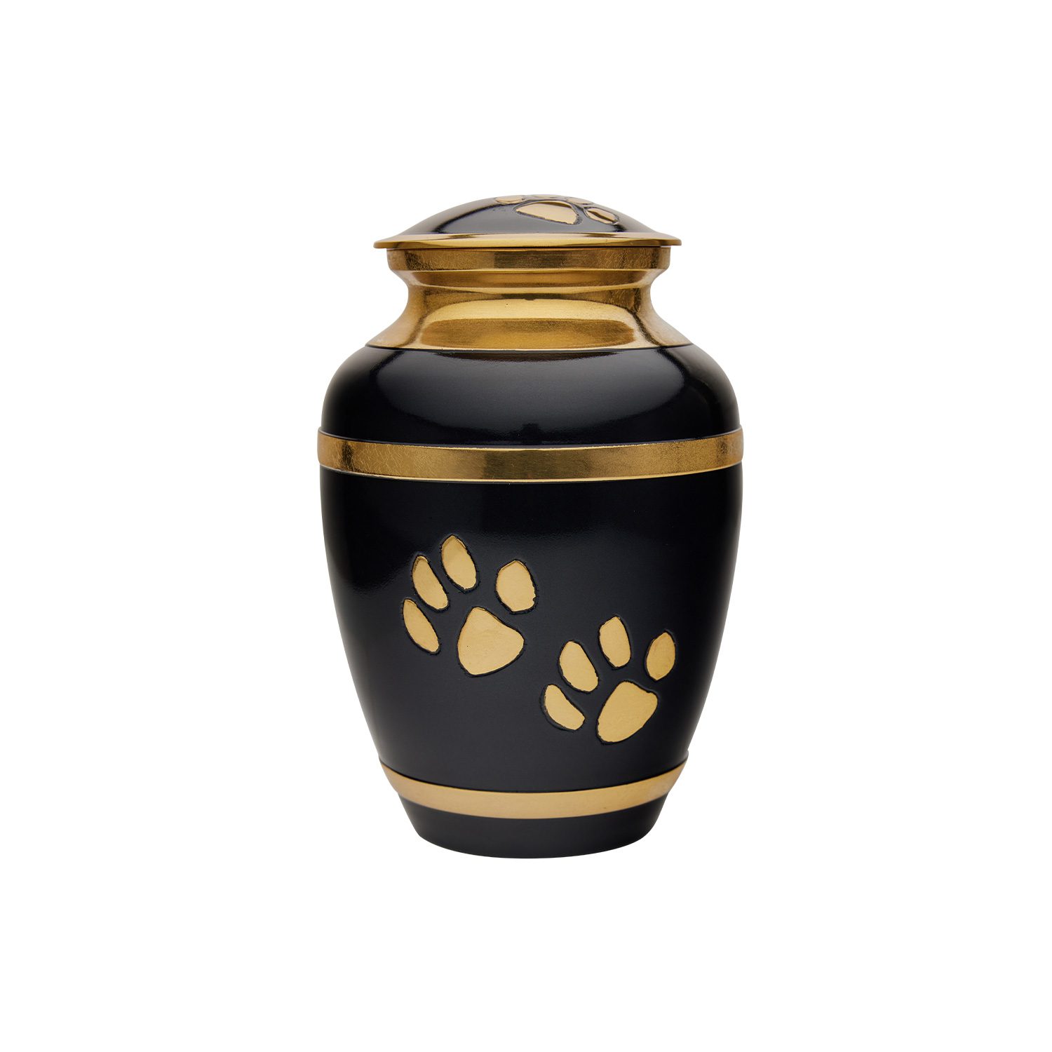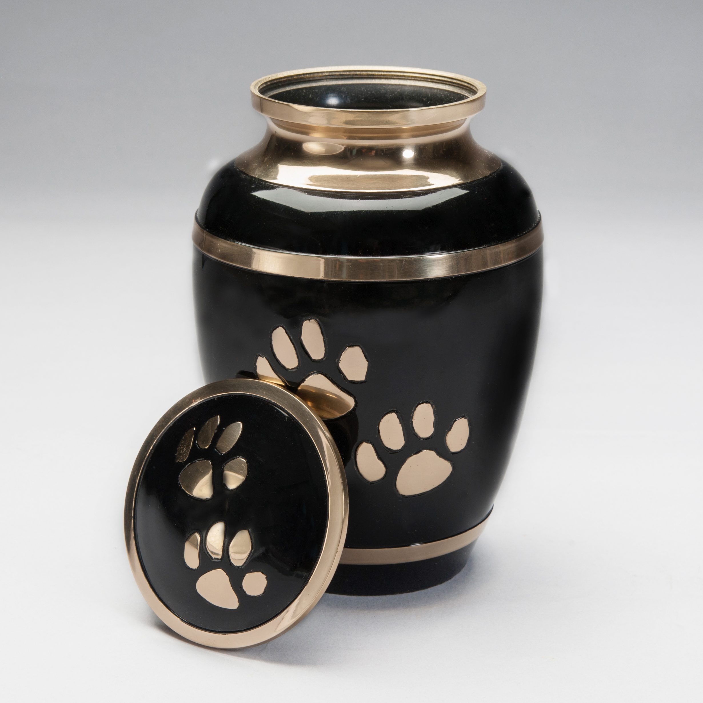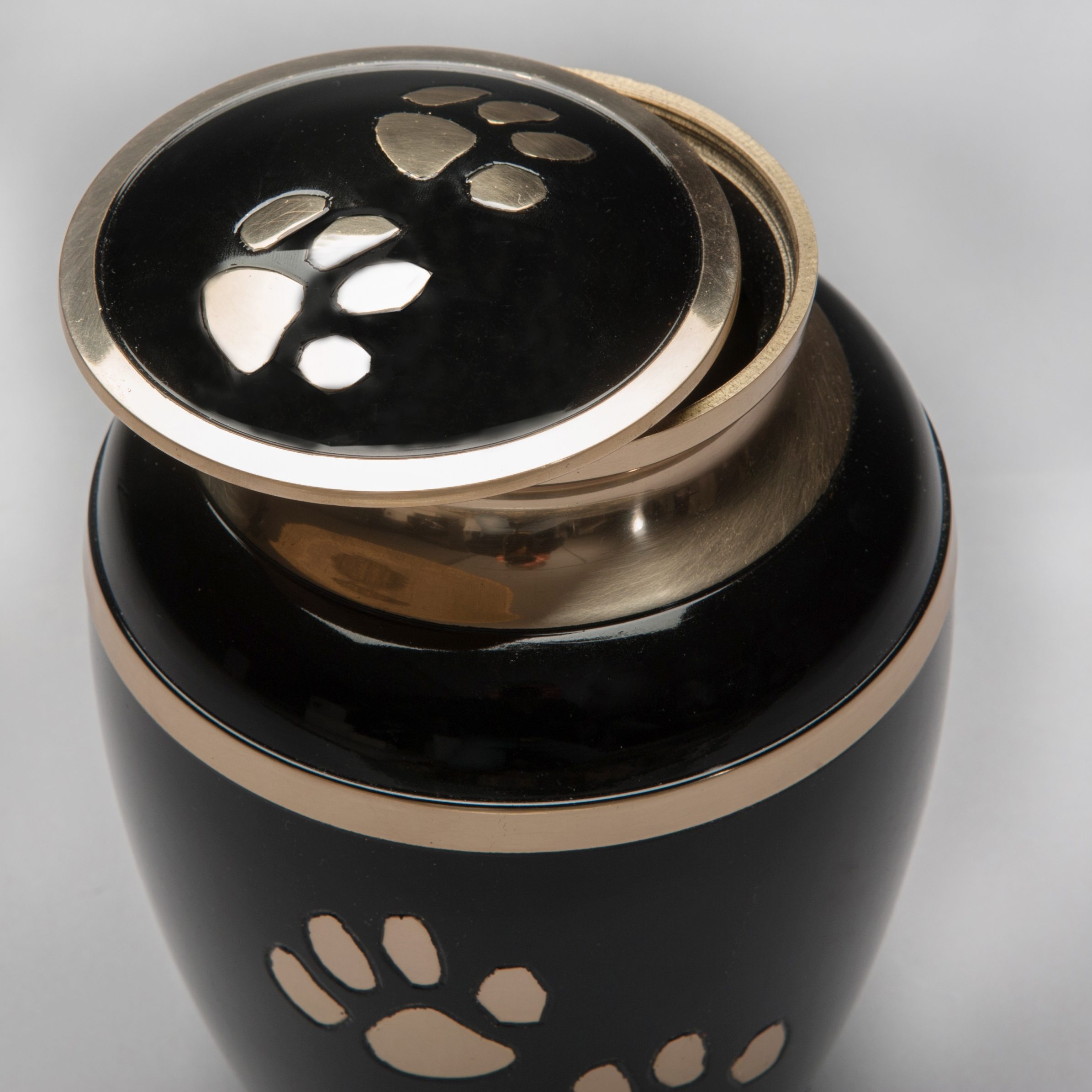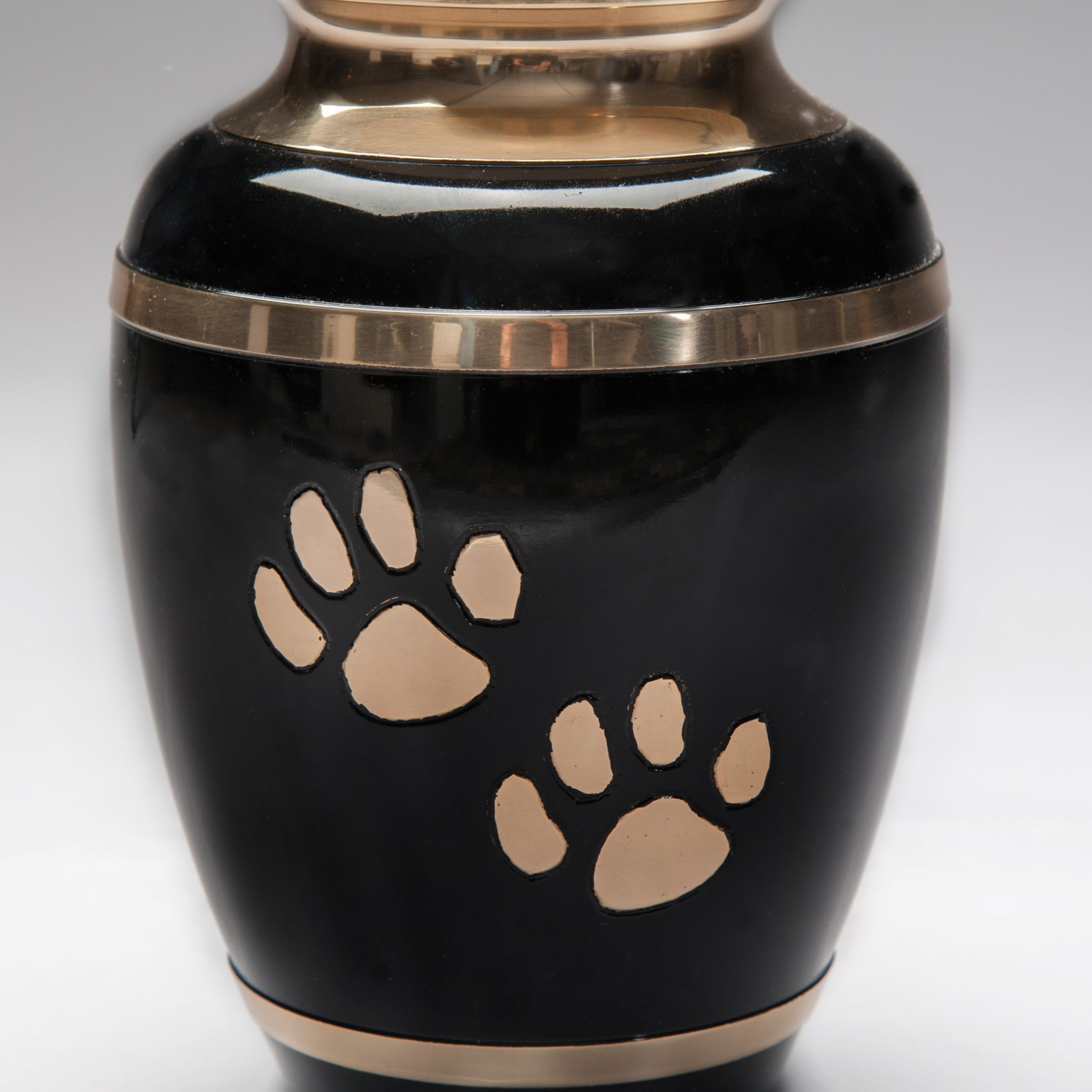 This series of urns can only be found here with Pet Passages. Unique, elegant and made with supreme quality the Devotion Series is designed to honor your friends devotion to you. The Ebony urn is solid brass with a black color enamel accented with golden paw prints on one side of the urn and on the lid. Hand forged and carved by old-world artisans, each urn comes with a precisely threaded screw-on top to provide an easy way to secure your pet’s ashes. You can add a customized engraving right on the urn itself and not only will it personalize your friend’s urn but it will enhance its beauty. (Engraving will be placed just to the right of the top paw print on the front of the urn).