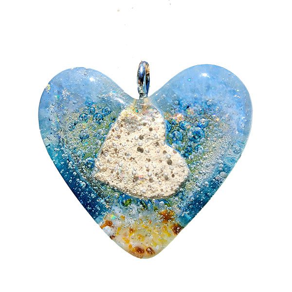 The Pet Passages Fillable Glass Memorial – Heart. This is a hand crafted glass memorial that can hold a small portion of your pet’s cremated remains. In the crafting of this art piece, we use dichroic glass which adds a shiny sparkle to each piece. Within the main heart you can see a small heart chamber that you can fill with a portion of your pet’s ashes and/or fur. Unlike other glass memorials that require you to send your pet’s ahes out to be hand crafted, these are pre-made and self fillable. These pieces can be worn as a pendant or carry them on your person in a pocket or purse or add a ribbon to the bail and hang on a Christmas Tree or in a place where natural sunlight can illuminate them. So many options.