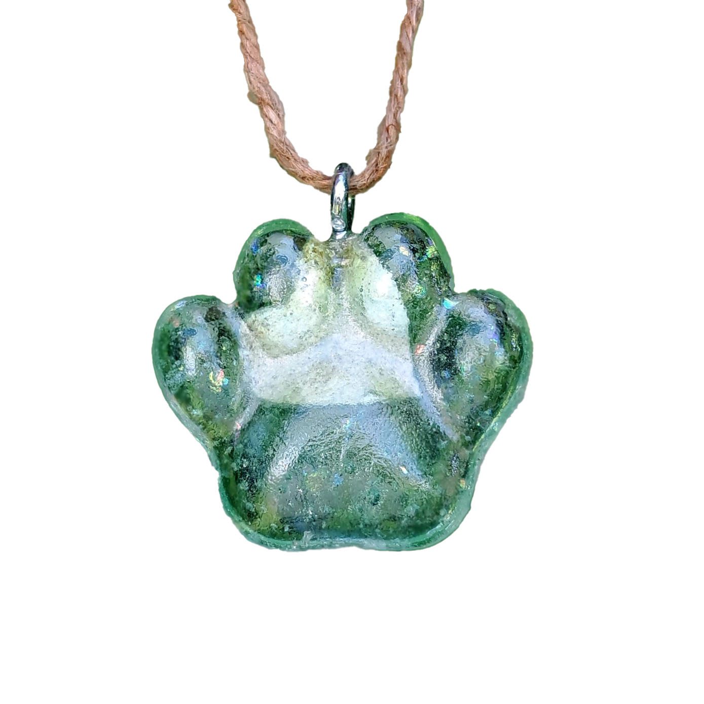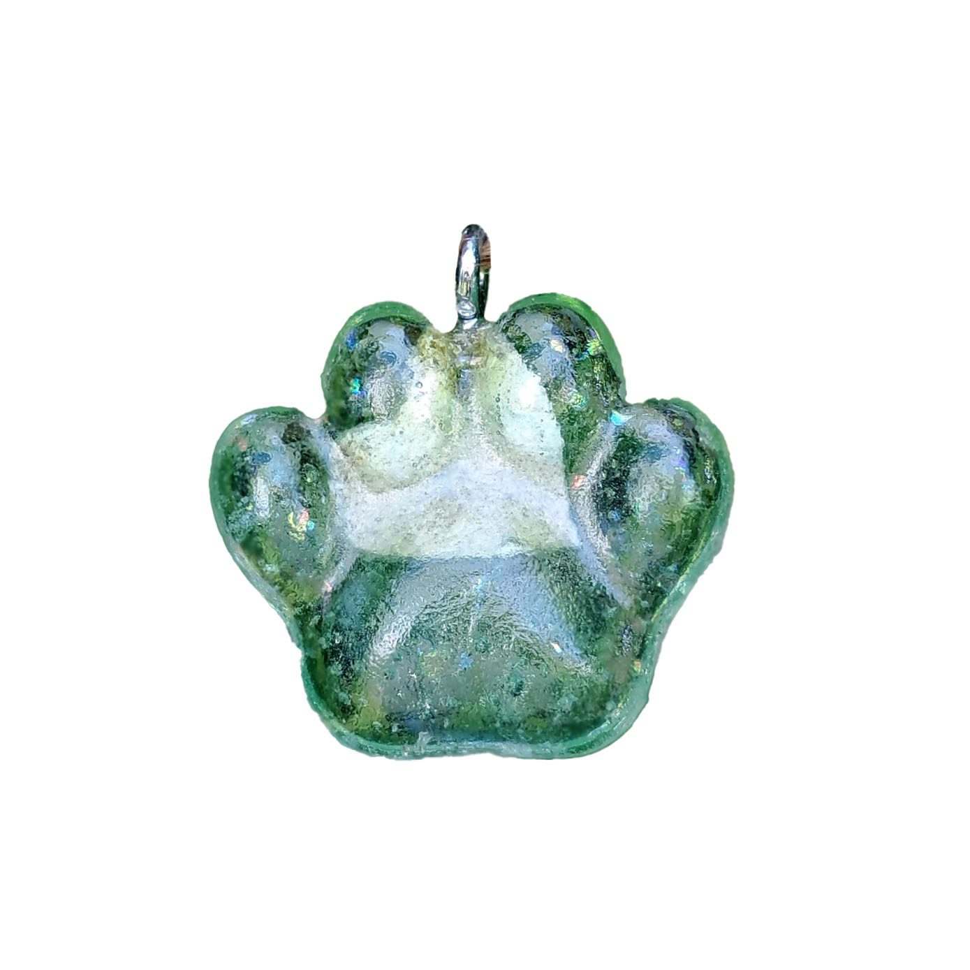 The Pet Passages Fillable Glass Memorial – Paw. This is a hand crafted glass memorial that can hold a small portion of your pet’s cremated remains. In the crafting of this art piece, we use dichroic glass which adds a shiny sparkle to each piece. Within the paw you can see a small heart chamber that you can fill with a portion of your pet’s ashes and/or fur. Unlike other glass memorials that require you to send your pet’s ahes out to be hand crafted, these are pre-made and self fillable. These pieces can be worn as a pendant, or carry them on your person in a pocket or purse or add a ribbon to the bail and hang on a Christmas Tree or in a place where natural sunlight can illuminate them. So many options.