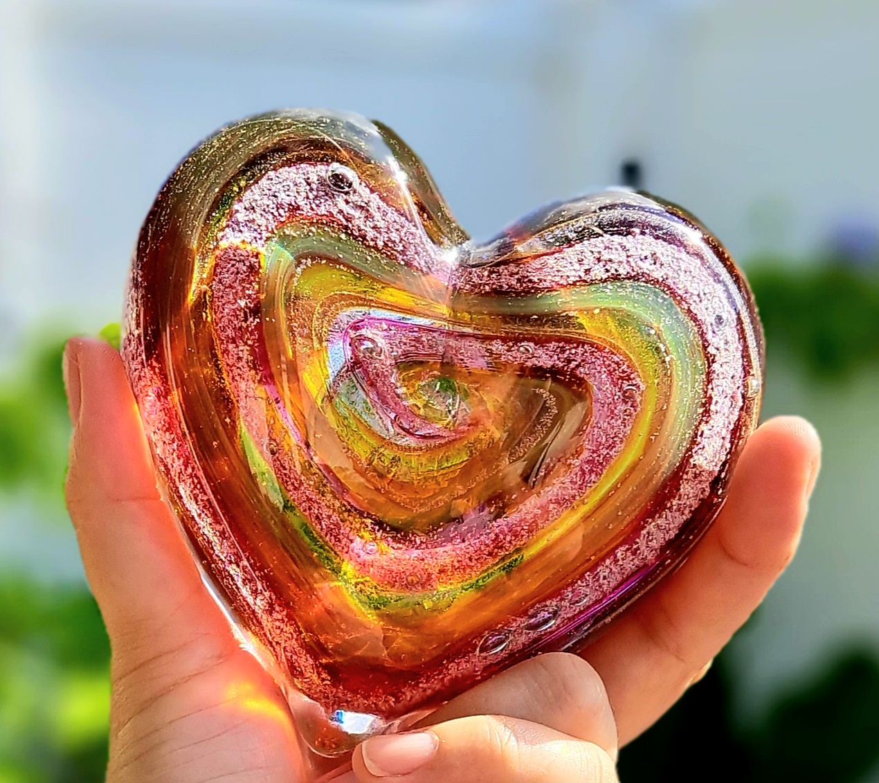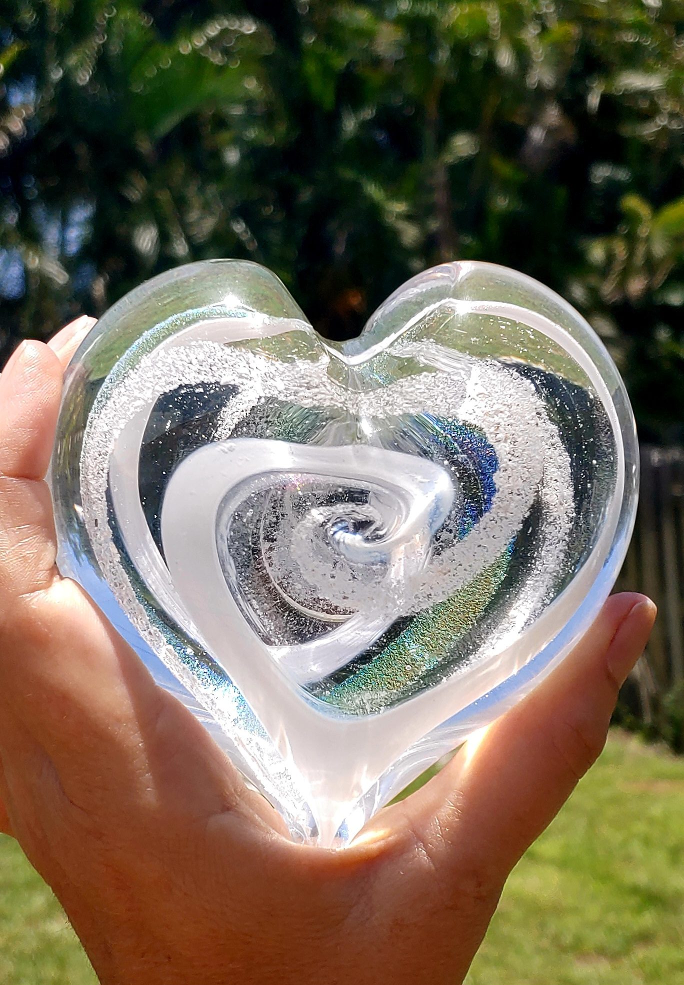 Pet Passages Glass Memorial – Hearts are hand crafted of glass and can hold a small portion of your pet’s cremated remains. In the crafting of this art piece, we use dichroic glass which will add sparkle and enhance the ash within. Each orb is approximately 4 – 4 1/2″ in diameter and can be placed anywhere. They especially look great in places where natural sunlight can illuminate them. Lay them flat or we highly recommend the 4 post acrylic stand for a truly beautiful presentation. Our artists use a small portion (1 tablespoon) of your pet’s ashes and create a unique one of a kind piece to honor your beloved pet. Please know that this piece is custom made by our artists so color and size may vary slightly. Our process takes between 4-6 weeks to complete after receiving the ashes.