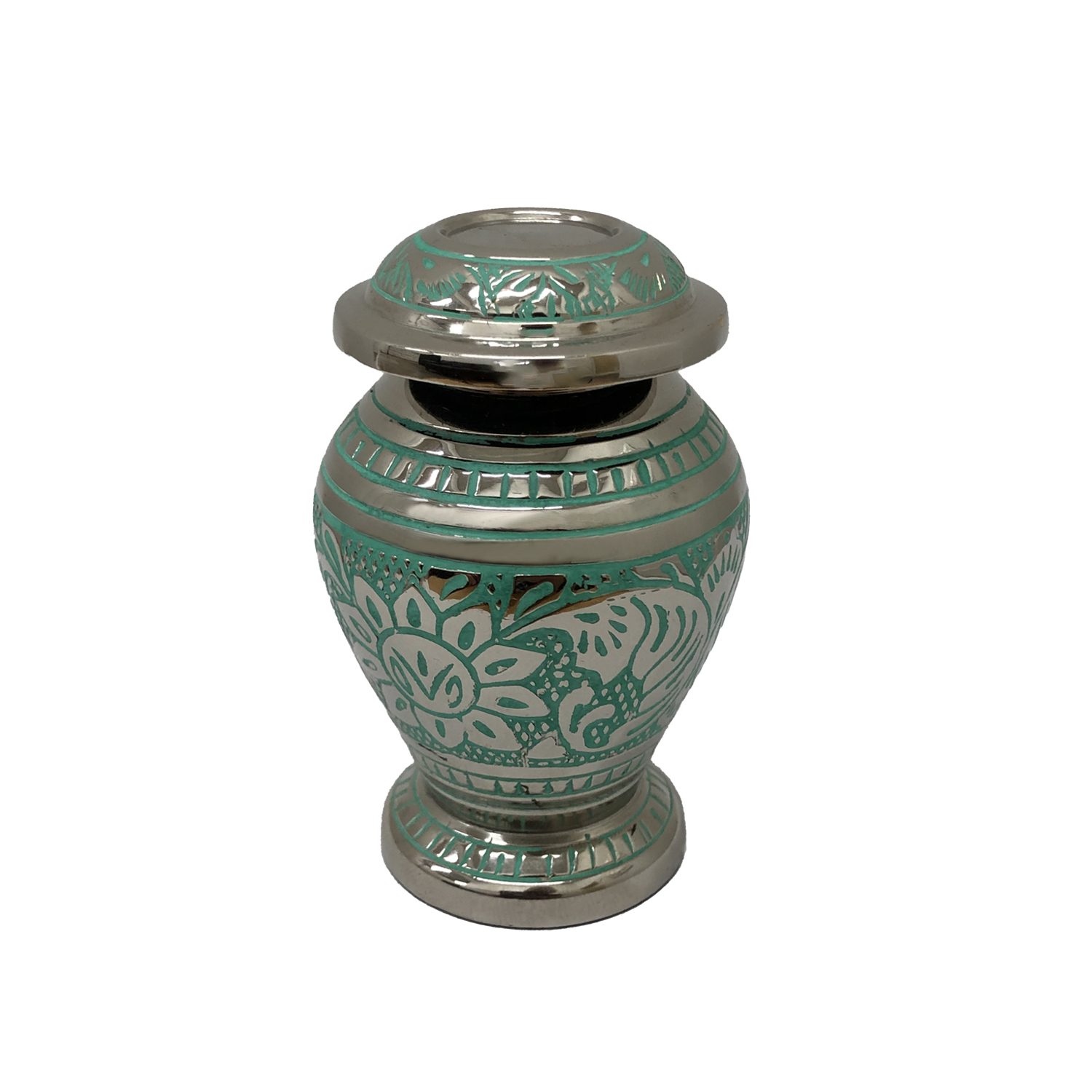 The Jali Green Keepsake is a handcrafted keepsake urn with a high polished silver finish and green lacquer accents. Designed exclusively for Pet Passages, the attention to detail is stunningly beautiful.