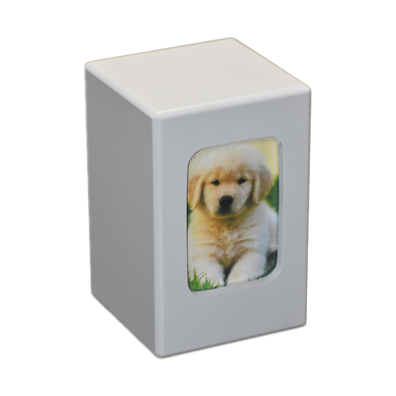 The Loving Portrait photo urn is designed for pet owners who wish to display their favorite 4″ x 6″ photograph of their beloved pet. The urn is crafted from wood with a pure white finish. The photo can be placed behind the acrylic window by removing the bottom of the urn where the photo can then be easily inserted. This urn is easily opened and closed through the bottom with a removable base and screws. The bottom of the urn also has four soft black felt pads which will help prevent damage when placed on delicate surfaces such as wood or glass.