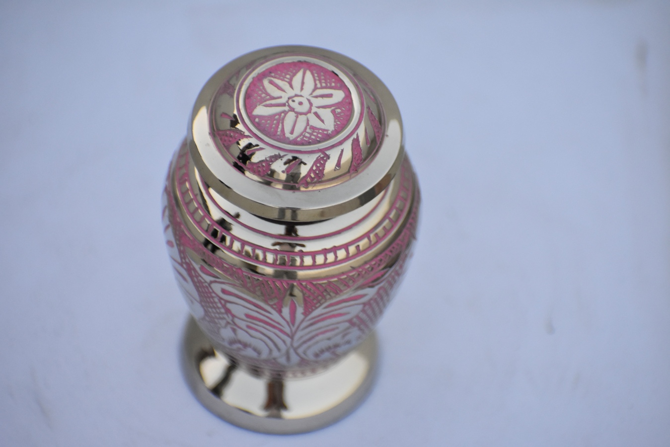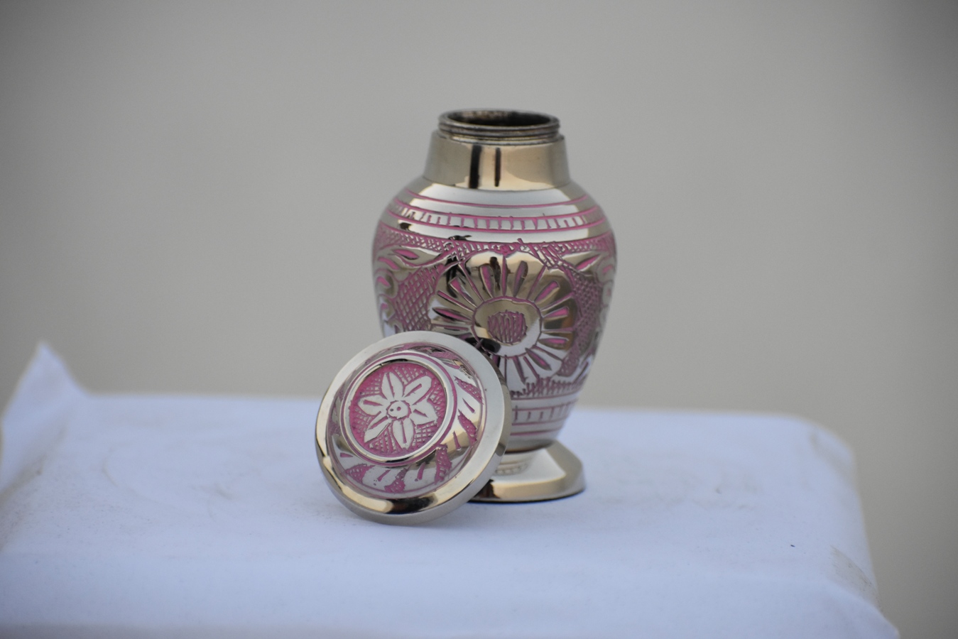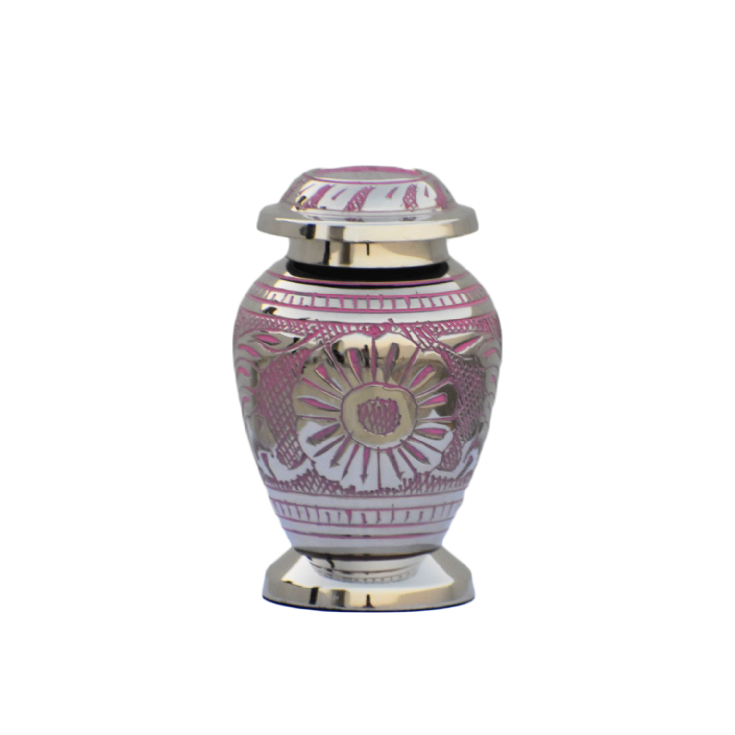 The Jali Pink Keepsake is a handcrafted keepsake urn with a high polished silver finish and pink lacquer accents. Designed exclusively for Pet Passages, the attention to detail is stunningly beautiful.