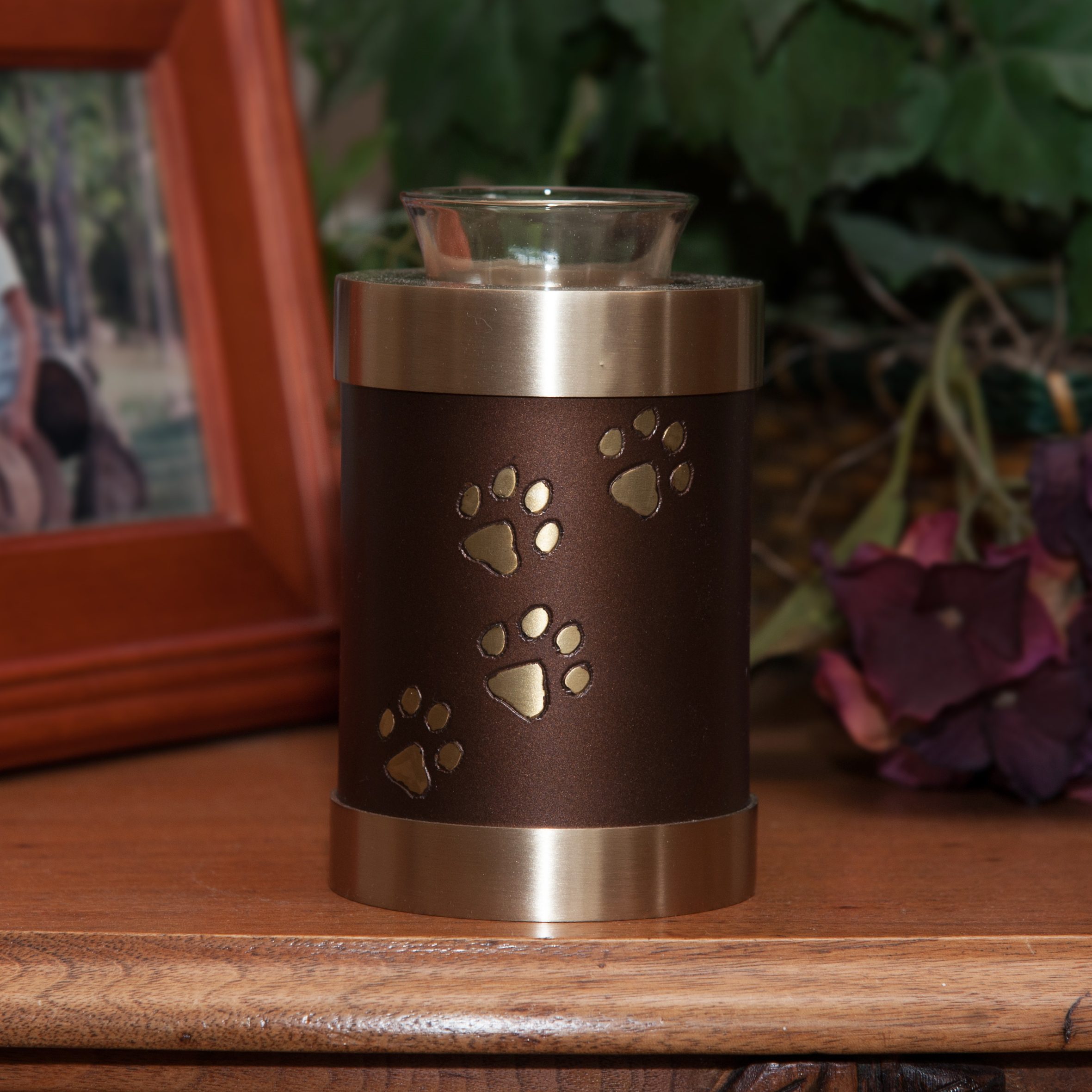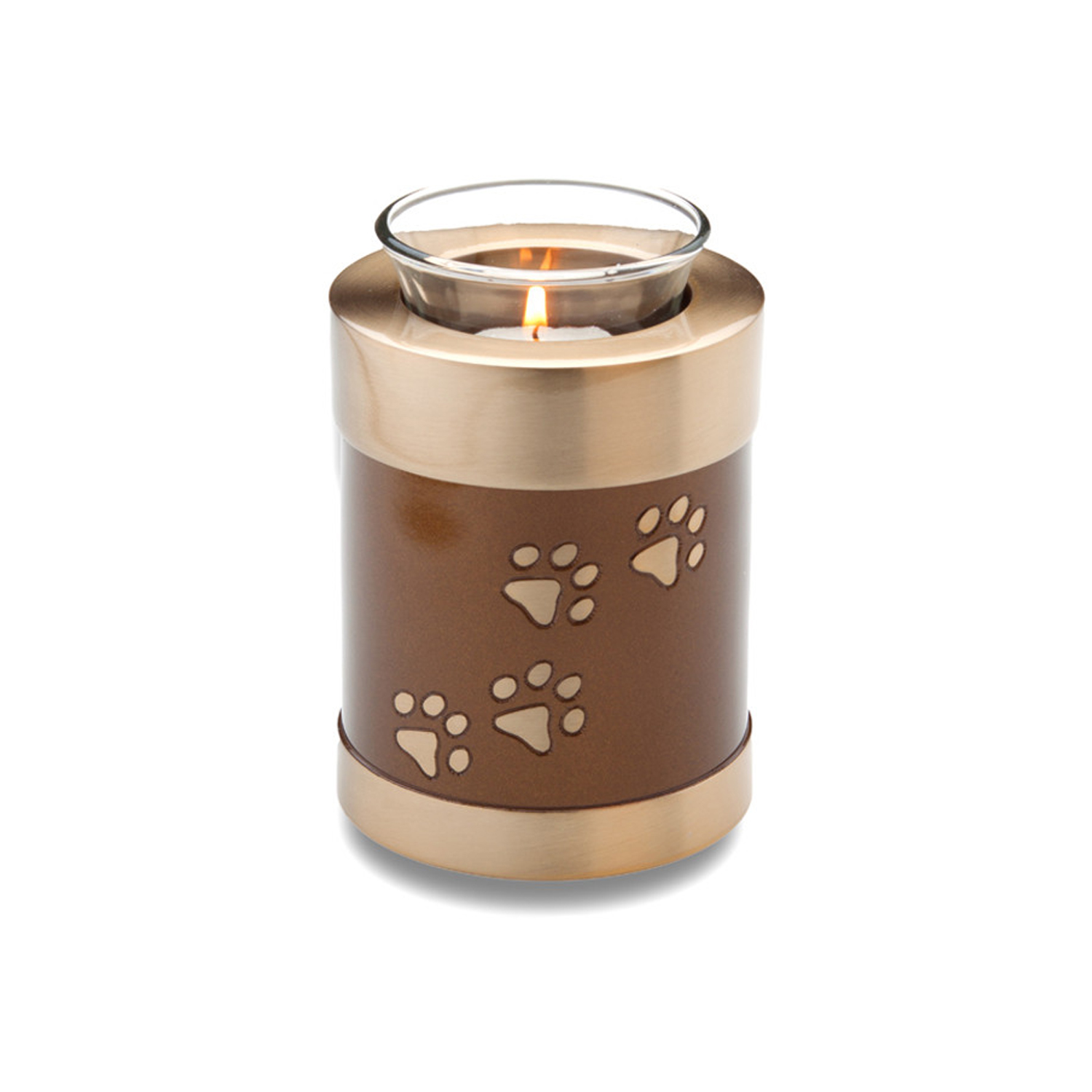 Made of solid brass with paw prints the Tea Light Urn can hold a small amount of ashes and is often used to as a keepsake urn. Keepsake urns are used to hold a small portion of ashes while the majority of the ashes are scattered or buried.