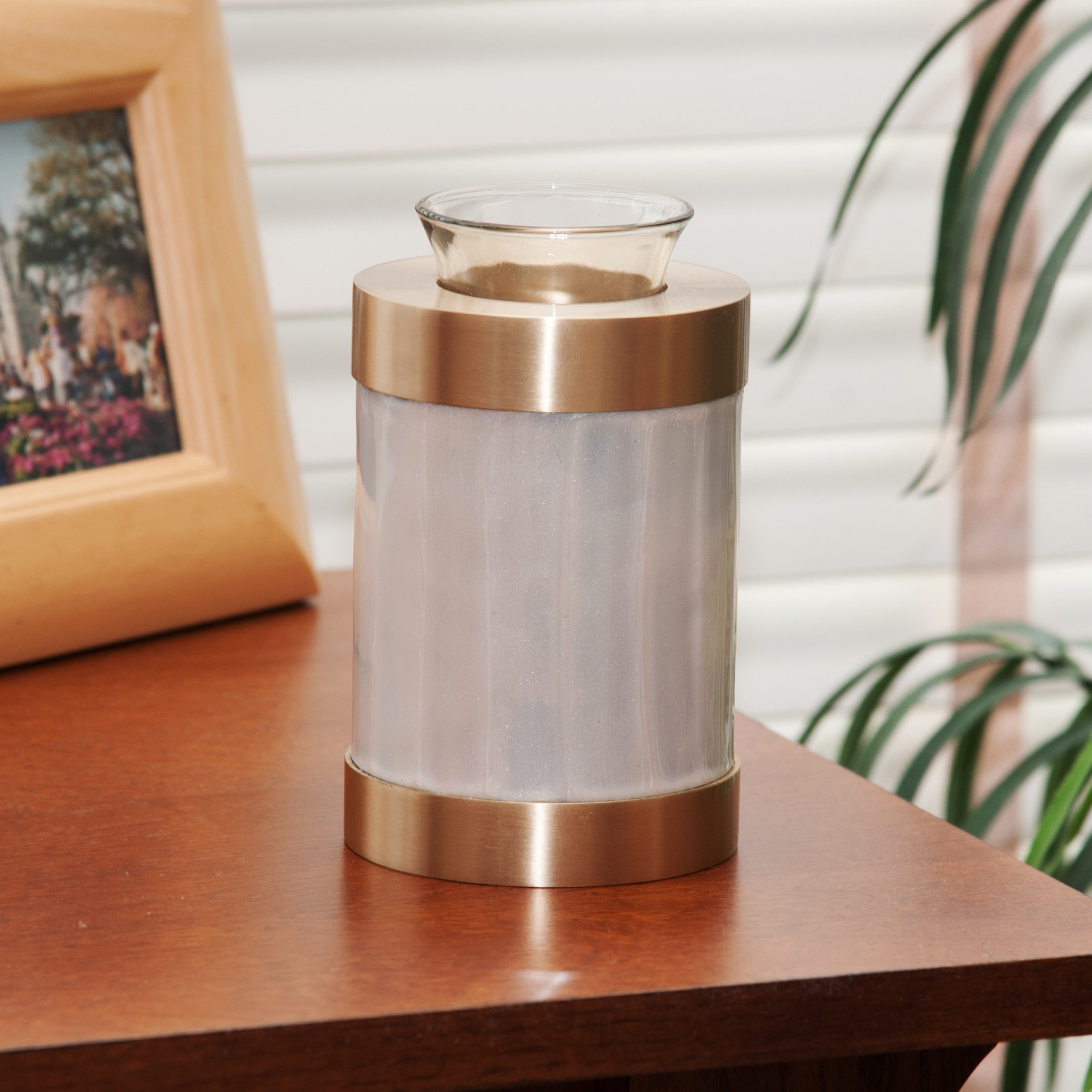 Made of solid brass the Tea Light Pearl Urn can hold a small amount of ashes and is often used to as a keepsake urn. Keepsake urns are used to hold a small portion of ashes while the majority of the ashes are scattered or buried. This brass urn has a pearlescent enamel that is hand-applied on each urn creating a prismatic effect like the pearly sheen found in an oyster.
