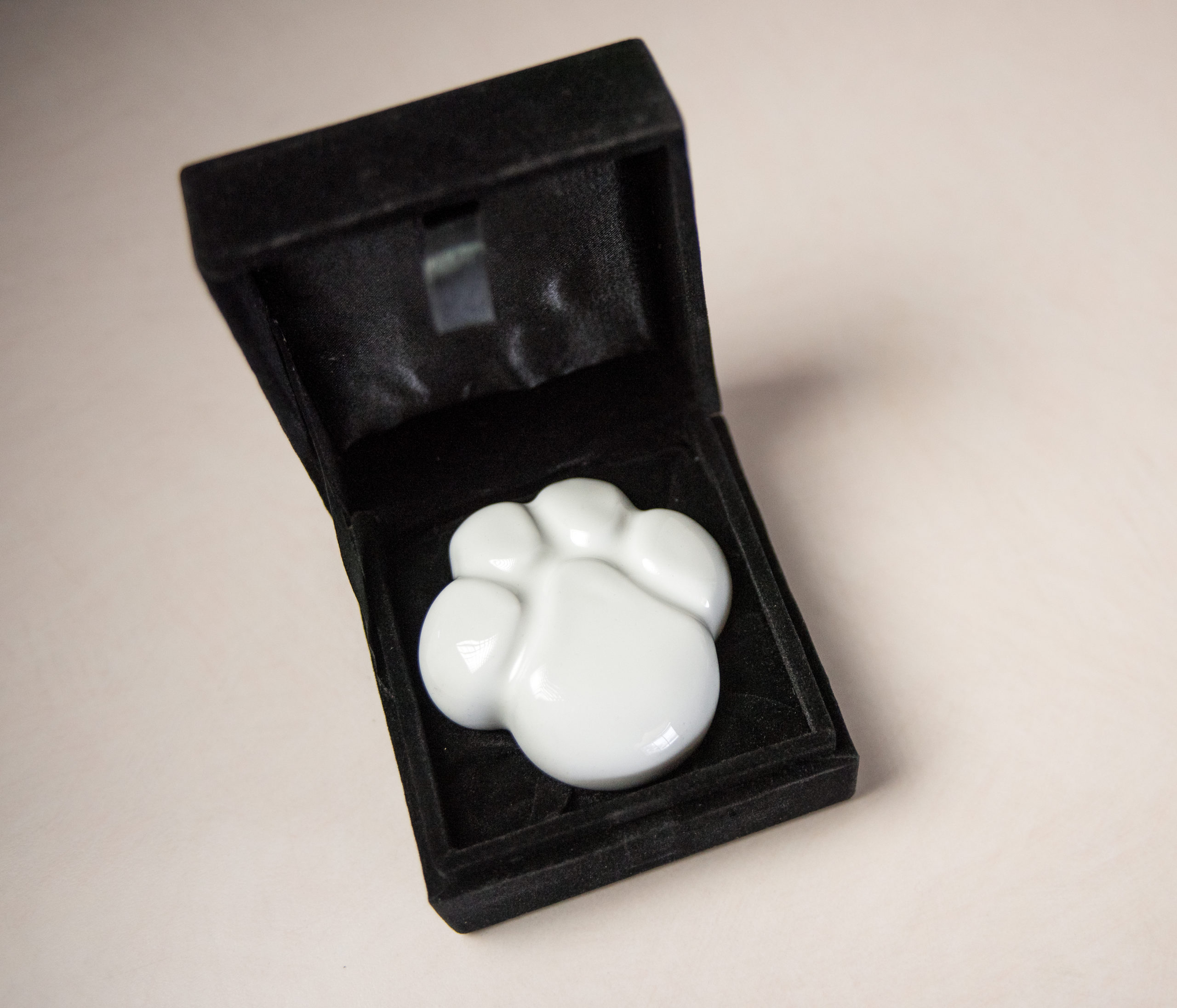 Treasured Paw keepsake cremation urn is a traditional way to keep a small portion of your beloved pet close to your heart. This high gloss aluminum urn has a bottom-opening screw in plug to easily insert cremated remains. Come in a handsome black velvet presentation box.